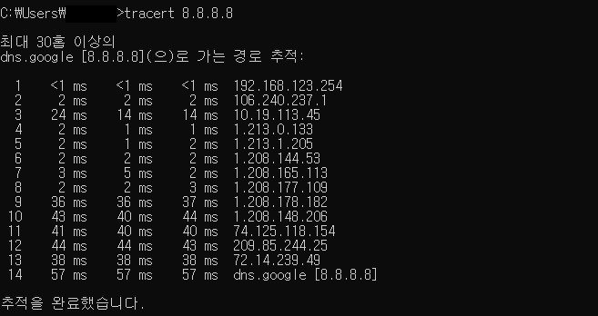 지정된 호스트에 도달할 때까지 통과하는 경로의 정보와 각 경로에서의 지연시간을 추적한다.